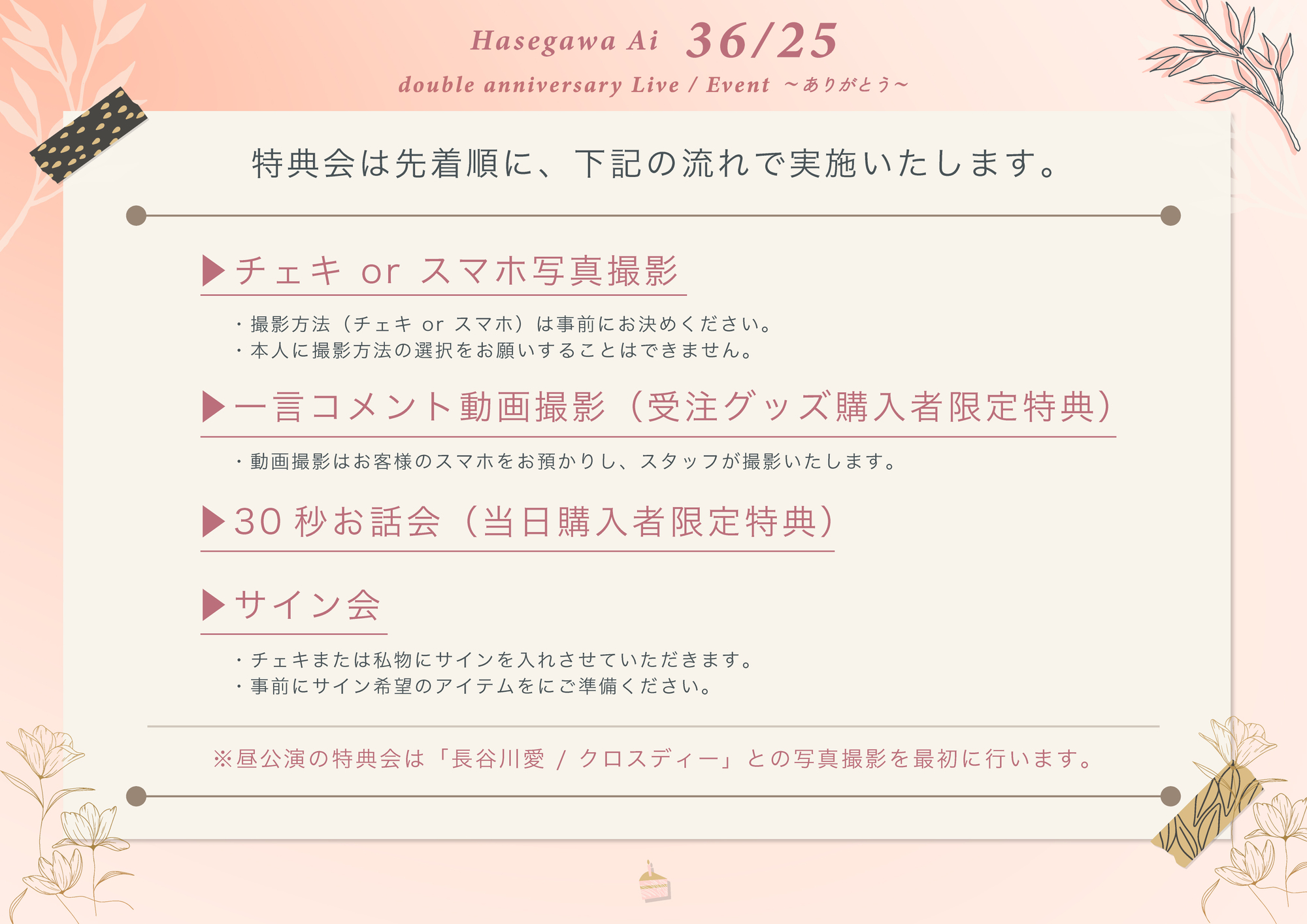 ※昼公演の特典会は「長谷川愛 / クロスディー」との写真撮影を最初に行います。
